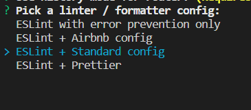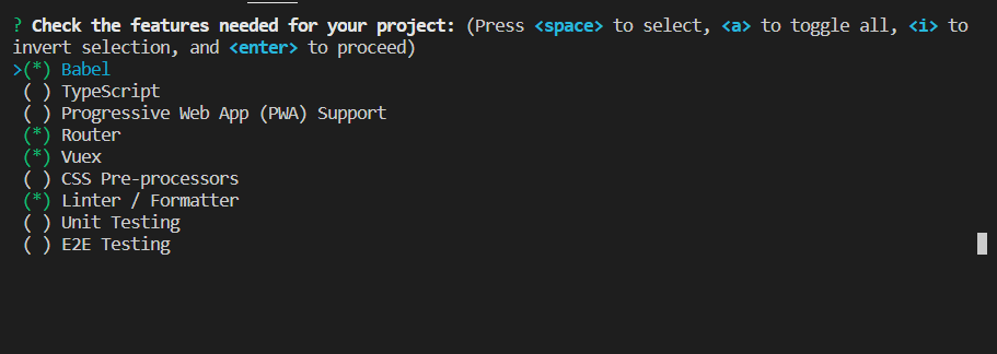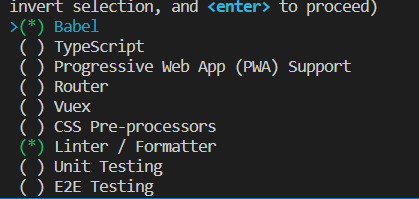 이처럼 나오고 우리는 babel, router, vuex, eslint 를 사용할 것이다.우리는 원하는 설정을 Space 키로 정할 수 있다.
