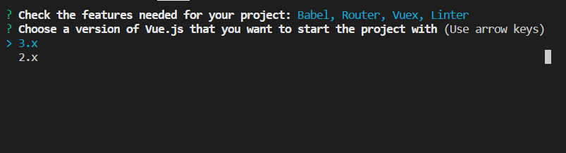 Space bar로 Babel, Router, Vuex, Linter를 설정한다. 그리고 엔터를 누르면