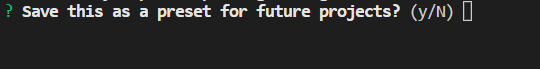 지금 설정 한 것을 다음번에도 설정 할 수 있게 프로젝트설정을 만들어둘래? 이건 아까 vue create frontend할 때 처음에 나온 설정을 save할 수 있는 것이다. 나는 save를 했기에 처음 만들 때 나온 것이다. 이것도 y yes
