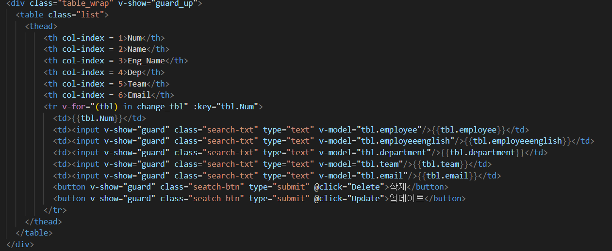v-show를 보면, 이름을 guard_down이라 해두었는데 이는 처음에는 True로 지정되어있다가, 다른 테이블이 나오면 false로 바뀔 것이다.